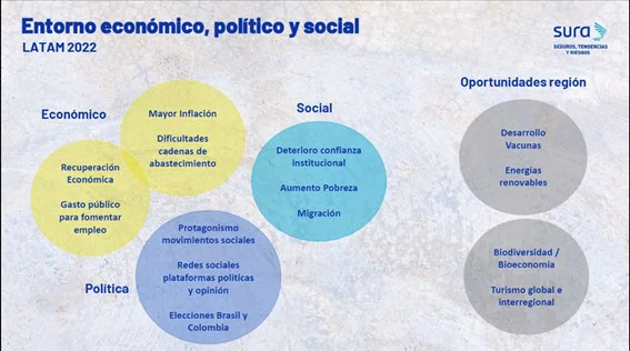 Problemas y desafíos existen de sobra en una región en la que más de 650 millones de personas conviven en 35 territorios con marcada desigualdad en múltiples niveles. Los líderes y los expertos en entorno social, político, económico y ambiental del Observatorio de Tendencias SURA, sin embargo, no tienen dudas en definir cuáles serán los principales retos para 2022 en América Latina: