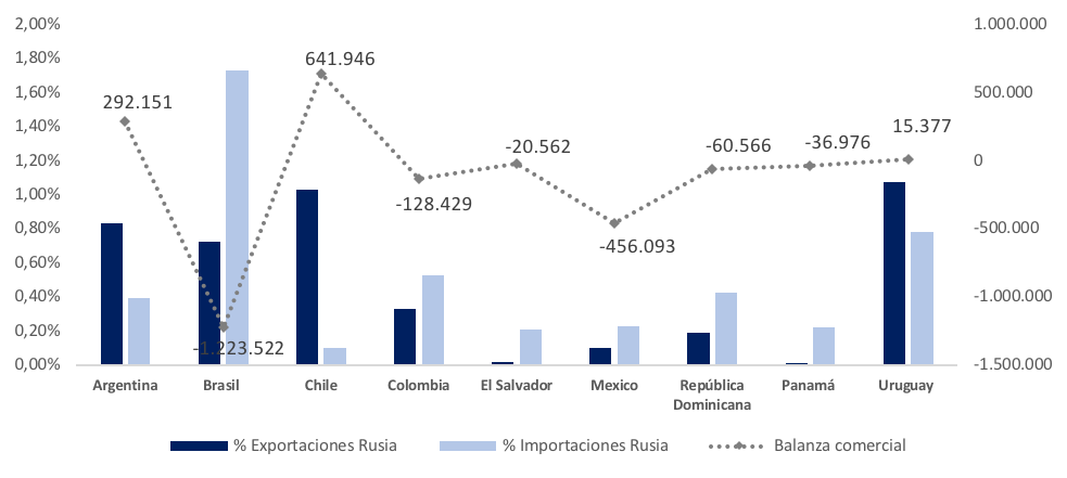 Argentina, Chile and Uruguay have a net surplus in trade relations with Russia, while Brazil, Colombia, El Salvador, Mexico, the Dominican Republic and Panama have a deficit. In general, exports and imports represent less than 2% of the total value of exports and imports.
