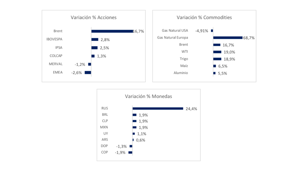 - Currencies such as the Colombian peso and the Dominican peso have shown slight appreciation in recent days, while the Russian ruble has depreciated by approximately 30%, reflecting the strong capital outflow that has been evident since Russia's formal invasion of Ukraine.