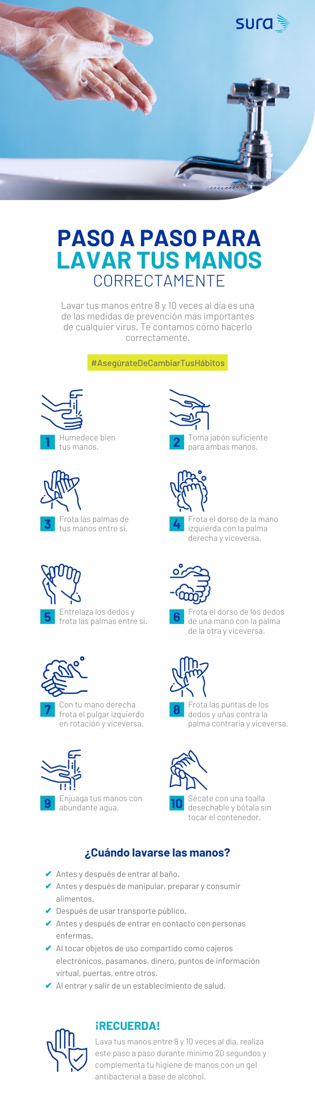 In the following infographic, we show you step by step and some recommendations so that, through proper hand hygiene, you can take care of yourself and those around you.