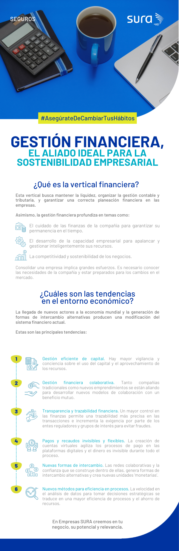Today, the business sector faces challenges such as cost variations, increased competition, various changes in demand, new technologies and the globalization of the economy. To ensure proper monetary management, at Empresas SURA we develop a financial vertical that seeks to strengthen companies and ensure their sustainability over time.